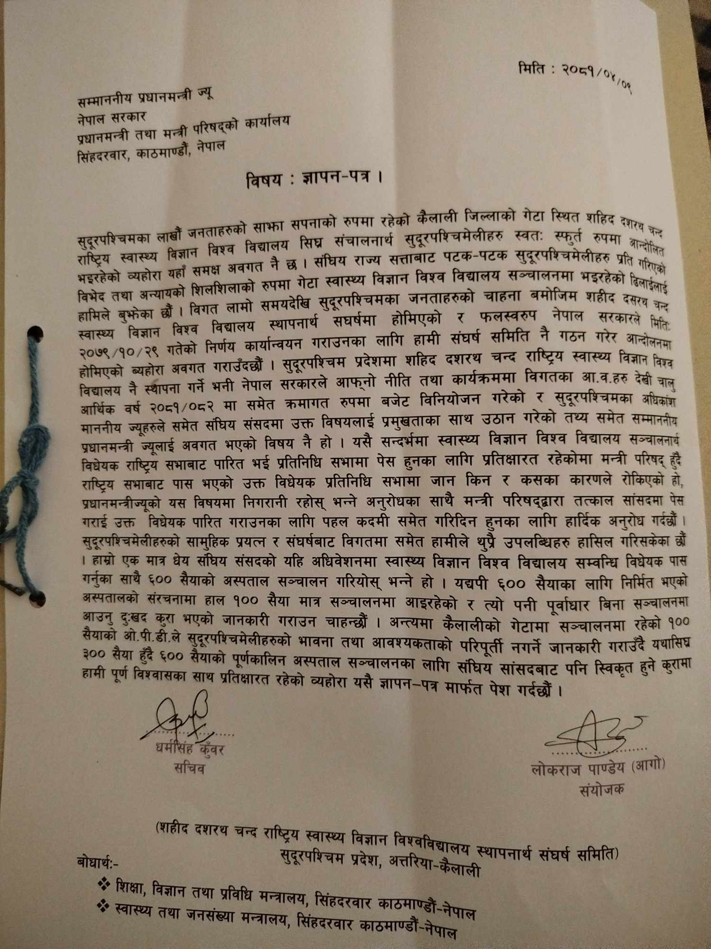 संघर्ष समितिका संयोजक लोकराज पाण्डेय (आगो) र सचिव धर्मसिंह कुँवरको हस्ताक्षर रहेको ज्ञापन पत्रमा संसद्को यही अधिवेशनमा स्वास्थ्य विज्ञान विश्व विद्यालय सम्बन्धी विधेयक पास गर्न माग गरिएको छ ।