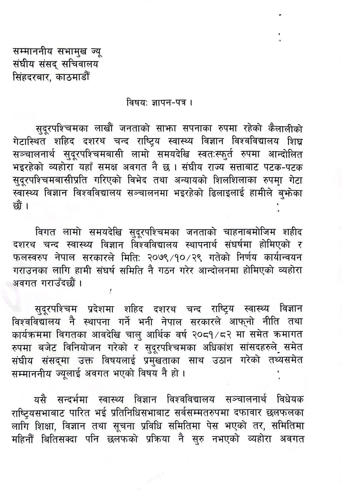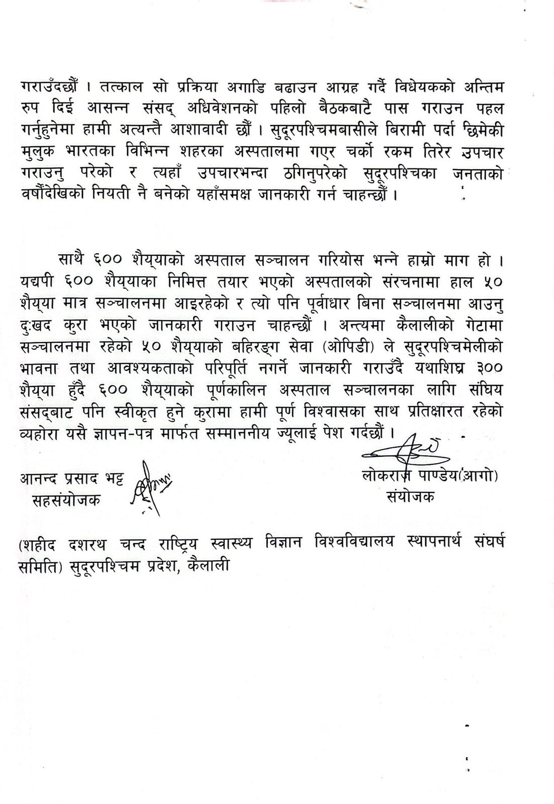 ‘स्वास्थ्य विज्ञान विश्वविद्यालय सञ्चालनार्थ विधेयक राष्ट्रियसभाबाट पारित भई प्रतिनिधिसभाबाट सर्वसम्मत रूपमा दफावार छलफलका लागि शिक्षा, विज्ञान तथा सूचना प्रविधि समितिमा पेस भएको तर, समितिमा महिनौँ बितिसक्दा पनि छलफलको प्रक्रिया नै सुरु नभएको ब्यहोरा अवगत गराउँदछौँ’ संघर्ष समितिका संयोजक लोकराज पाण्डेय (आगो) र सह–संयोजक आनन्द प्रसाद भट्टको हस्ताक्षर रहेको ज्ञापन पत्रमा भनिएको छ ‘तत्काल सो प्रक्रिया अगाडि बढाउन आग्रह गर्दै विधेयकको अन्तिम रूप दिई आसन्न संसद् अधिवेशनको पहिलो बैठकबाटै पास गराउन पहल गर्नुहुनेमा हामी अत्यन्तै आशावादी छौँ ।’