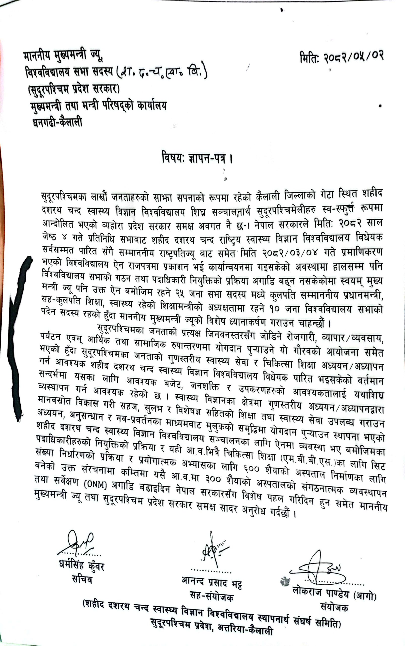 ‘विश्वविद्यालय ऐन राजपत्रमा प्रकाशन भई कार्यान्वयनमा गइसकेको अवस्थामा हालसम्म पनि विश्वविद्यालय सभाको गठन तथा पदाधिकारी नियुक्तिको प्रक्रिया अगाडि बढ्न नसकेकोमा स्वयम् मुख्य मन्त्री ज्यू पनि उक्त ऐन बमोजिम रहने २५ जना सभा सदस्य मध्ये कुलपति सम्माननीय प्रधानमन्त्री, सह–कुलपति शिक्षा, स्वास्थ्य रहेको शिक्षामन्त्रीको अध्यक्षतामा रहने १० जना विश्वविद्यालय सभाको पदेन सदस्य रहको हुँदा माननीय मुख्यमन्त्री ज्यूको विशेष ध्यानाकर्षण गराउन चाहन्छौँ,’ ज्ञापन पत्रमा उल्लेख गरिएको छ ।