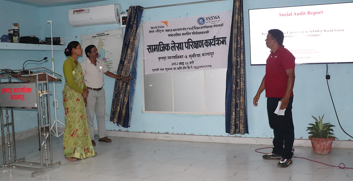 एनएनएसडब्लुएका निमित्त कार्यक्रम निर्देशक विनोद जैरुको अध्यक्षतामा भएको कार्यक्रममा परियोजनाका संयोजक रामेश्वर जैरुले ४ वटै परियोजनाको लेखाको अवस्था र गरेका कामबारेमा प्रस्तुति राखेका थिए भने सुदूरपश्चिम विश्वविद्यालयका प्राध्यापक डा. दीपक चन्द्र भट्टले परियोजनाको सामाजिक लेखा रिपोर्ट प्रस्तुत गरेका थिए ।