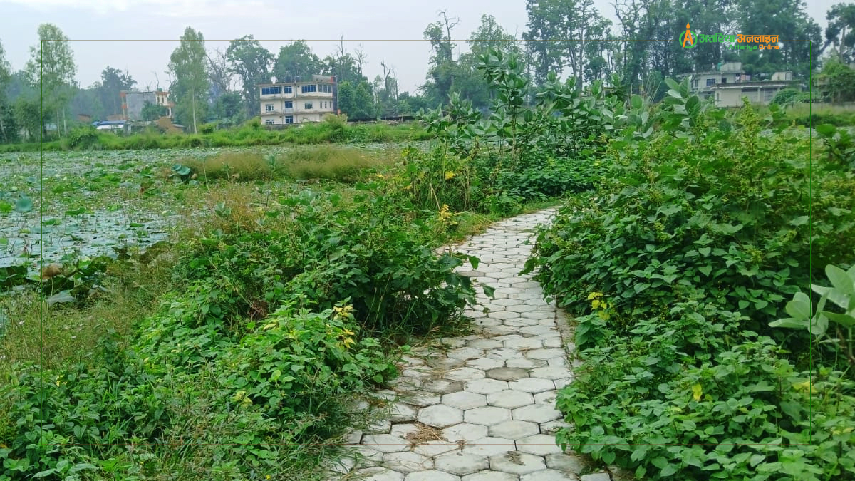 ‘ताल पुरै घाँसले भरिएको रहेछ । तालमा पानी नै छैन । यो कस्तो ताल हो’ उनले भनिन् ‘धनगढीमा भएको ताल यस्तो अवस्थामा नहुनुपर्ने हो ।’ धनगढी उपमहानगरपालिका – ७ देवरीयामा रहेको वनस्पति अनुसन्धान केन्द्रको वनस्पति उद्यान सँगै रहेको तालमा लामो समय देखि सरसफाइमा ध्यान नदिँदा कुरुप बनेको स्थानीय बताउँछन् । १२ दशमलव ५५ हेक्टरमा फैलिएको जखौर तालमा अहिले पुरै जलकुम्भी र घाँसले भरिएको छ । तालको वरपर घुम्नको लागि बनाइएको फुटपाथ सँगै बस्नका लागि राखिएका स्टुल पनि झाडीले ढाकिएका छन् ।