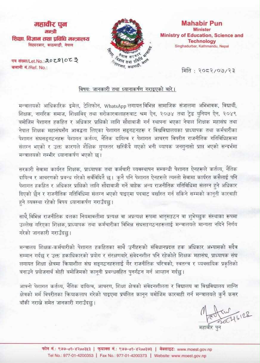 आइतबार एक सूचना जारी गर्दै मन्त्री पुनले विभिन्न राजनीतिक दलका नियमावलीमा प्रत्यक्ष वा अप्रत्यक्ष रूपमा भ्रातृ संगठन वा शुभेच्छुक संस्थाका रूपमा उल्लेख गरिएका शिक्षक, प्राध्यापक तथा कर्मचारीका विभिन्न संघ–संगगठनहरूलाई मन्त्रालयले मान्यता नदिने निर्णय गरेको जानकारी दिएका छन् ।