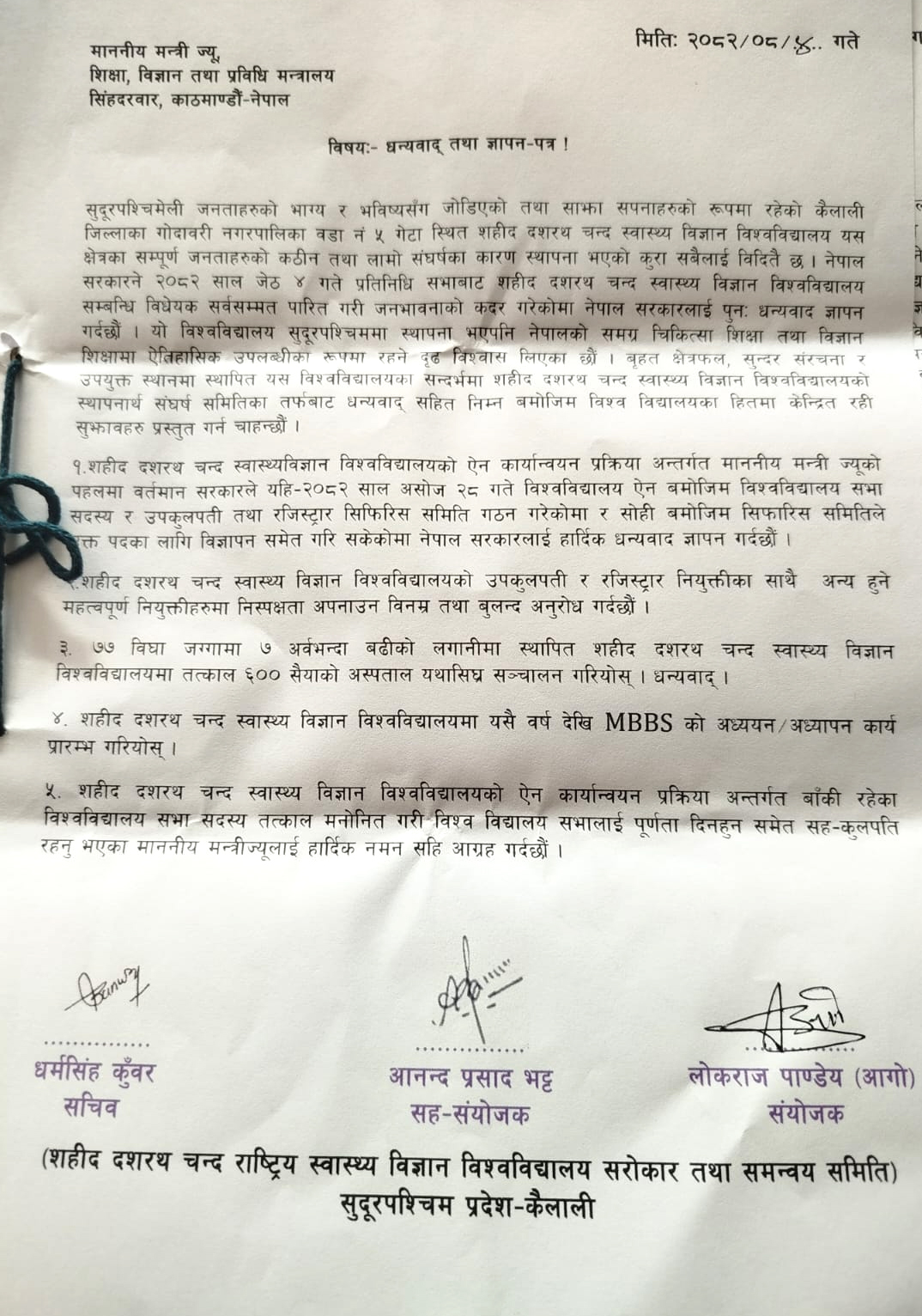 अत्तरिया – कैलालीको गेटा स्थित सहिद दशरथ चन्द राष्ट्रिय स्वास्थ्य विज्ञान विश्वविद्यालयका माग सहितको ज्ञापन पत्र शिक्षा, विज्ञान तथा प्रविधि मन्त्री महावीर पुनलाई बुझाइएको छ । बिहीबार सहिद दशरथ चन्द राष्ट्रिय स्वास्थ्य विज्ञान विश्वविद्यालय सरोकार तथा समन्वय समितिले शिक्षा मन्त्रीलाई धन्यवाद सहितको ज्ञापन पत्र बुझाएको हो ।