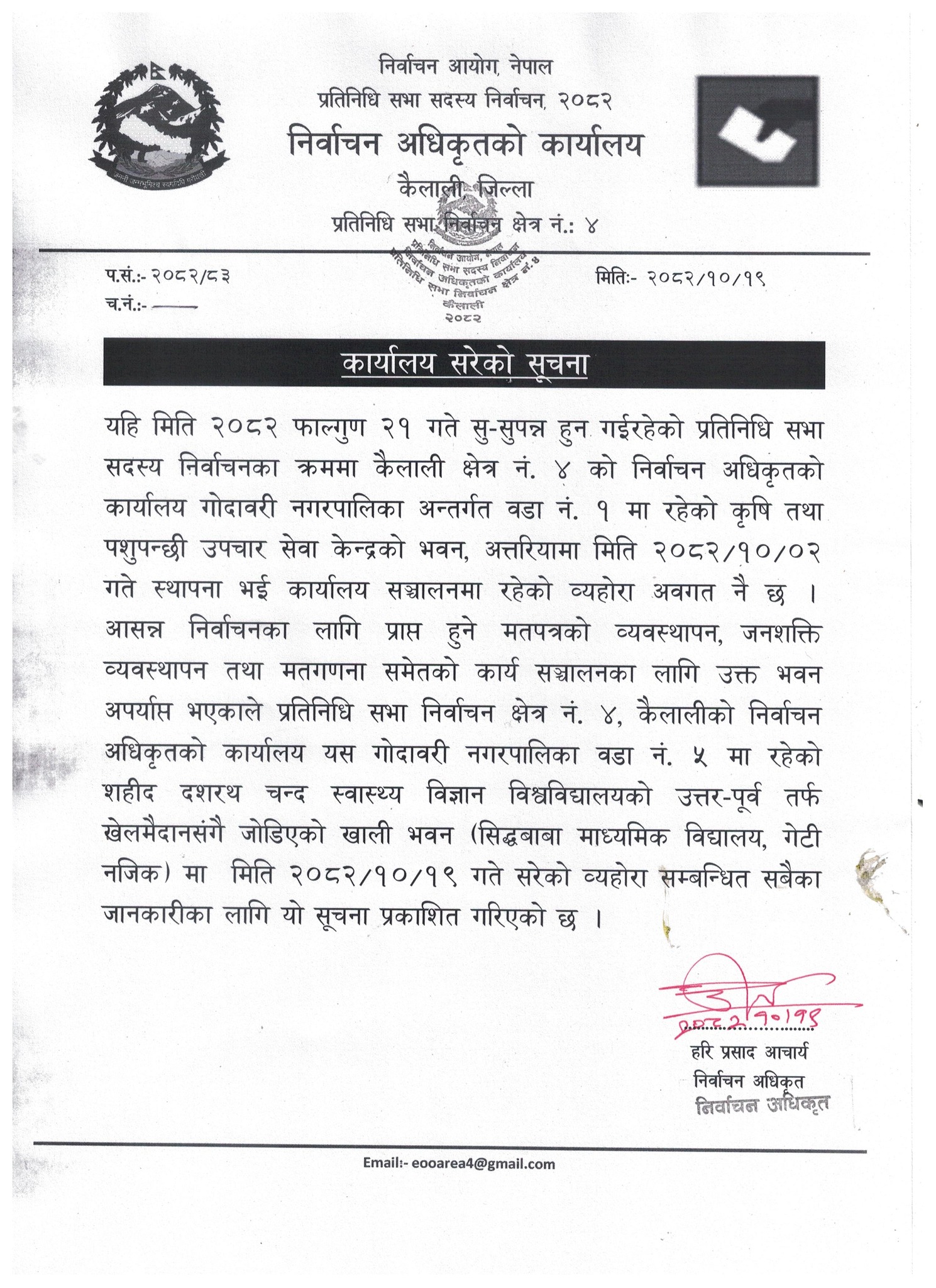 निर्वाचन अधिकृत हरि प्रसाद आचार्यद्वारा जारी सूचनामा शहीद दशरथ चन्द स्वास्थ्य विज्ञान विश्वविद्यालयको उत्तर–पूर्व तर्फ सिद्ध बाबा माध्यमिक विद्यालय खेलमैदान सँगै जोडिएको खाली भवनमा कार्यालय सरेको उल्लेख छ ।