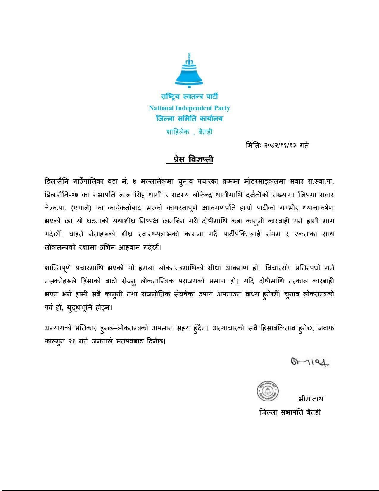बैतडी — राष्ट्रिय स्वतन्त्र पार्टी (रास्वपा) बैतडीले दिलासैनी गाउँपालिका–७ मलासलेक क्षेत्रमा चुनाव प्रचारका क्रममा आफ्ना नेता तथा कार्यकर्तामाथि भएको कायरतापूर्ण आक्रमणको निष्पक्ष छानबिन गरी दोषीमाथि कडा कारबाही गर्न माग गरेको छ।