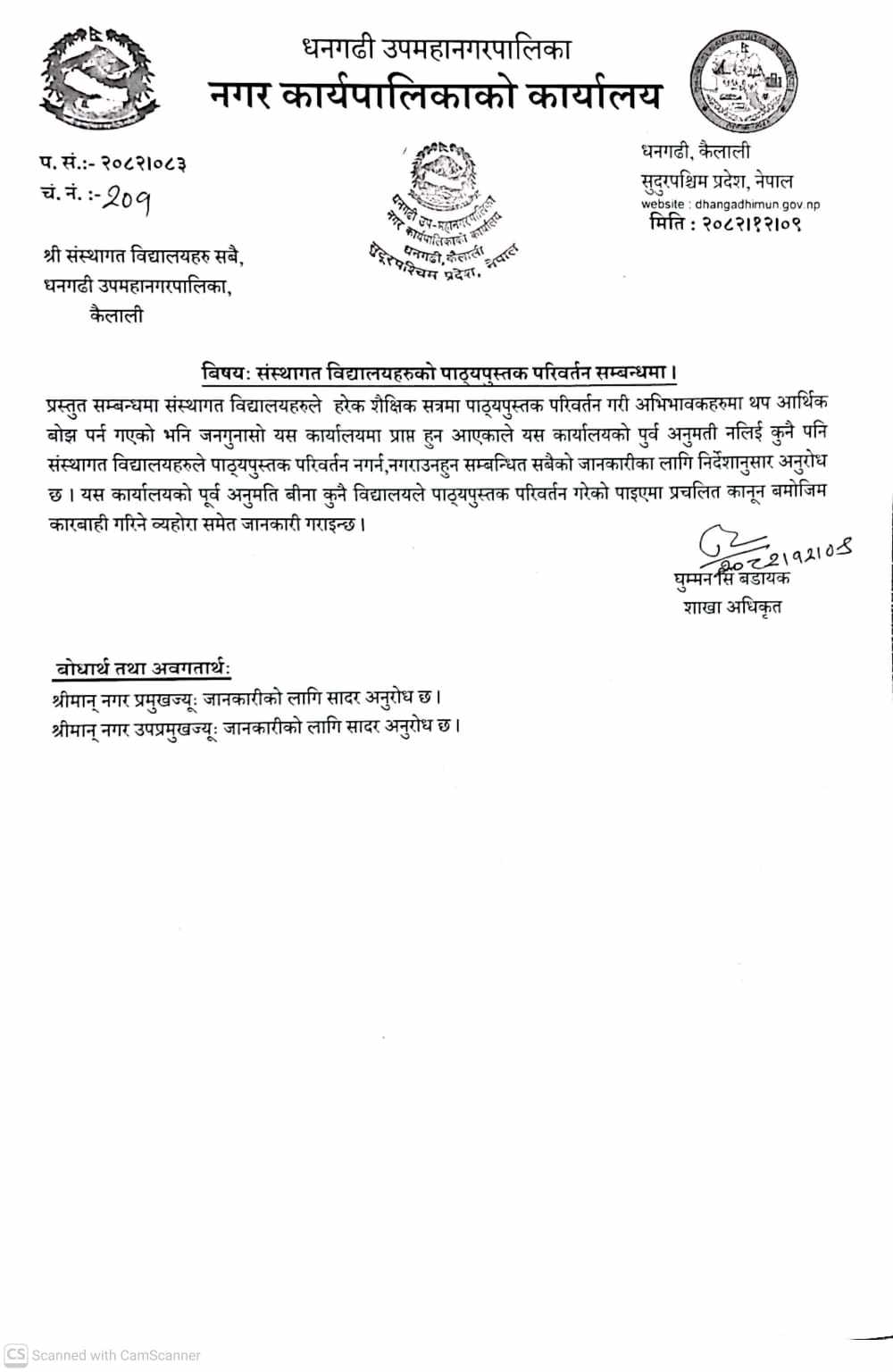 धनगढी उपमहानगरपालिकाका शाखा अधिकृत घुम्मन सिंह बडायकको हस्ताक्षर रहेको पत्रमा पूर्व अनुमति बिना कुनै विद्यालयले पाठ्यपुस्तक परिवर्तन गरेको पाइएमा प्रचलित कानुन बमोजिम कारबाही हुने उल्लेख छ ।