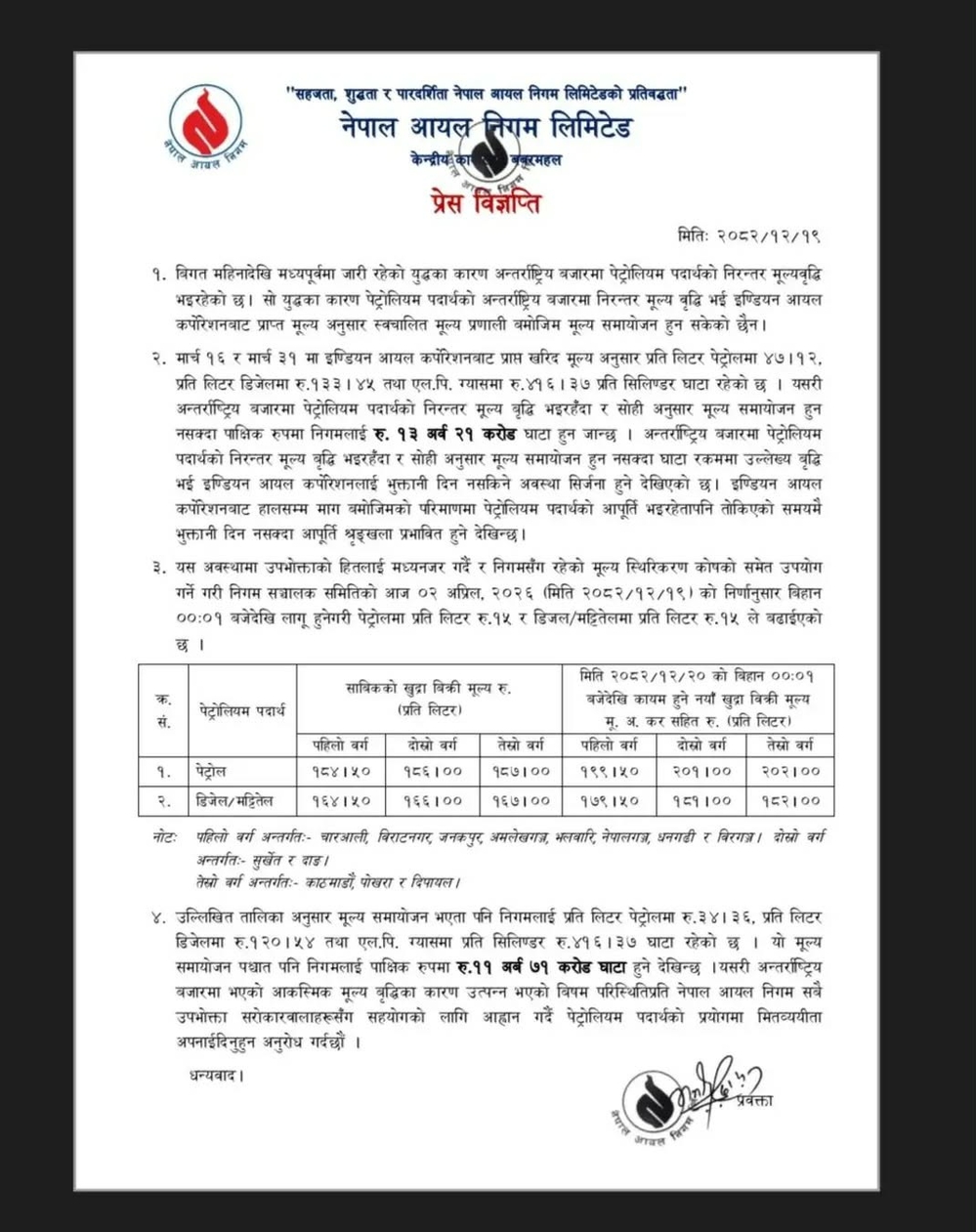 अन्तर्राष्ट्रिय बजारमा पेट्रोलियम पदार्थको मूल्य बढिरहेकाले स्थानीय बजारमा पनि मूल्य बढाउनुपरेको निगमले स्पष्ट पारेको छ ।