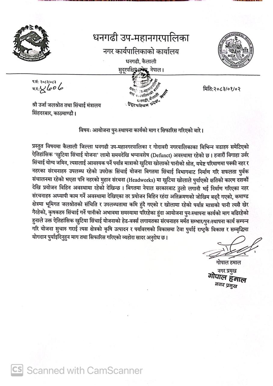 उप–महानगरपालिकाले मन्त्रालयलाई पठाएको पत्रमा कैलाली जिल्लाको धनगढी उप–महानगरपालिका र गोदावरी नगरपालिका लगायतका क्षेत्र समेटिएको खुटिया सिँचाइ योजना लामो समयदेखि निष्क्रिय अवस्थामा रहेको उल्लेख गरिएको छ ।