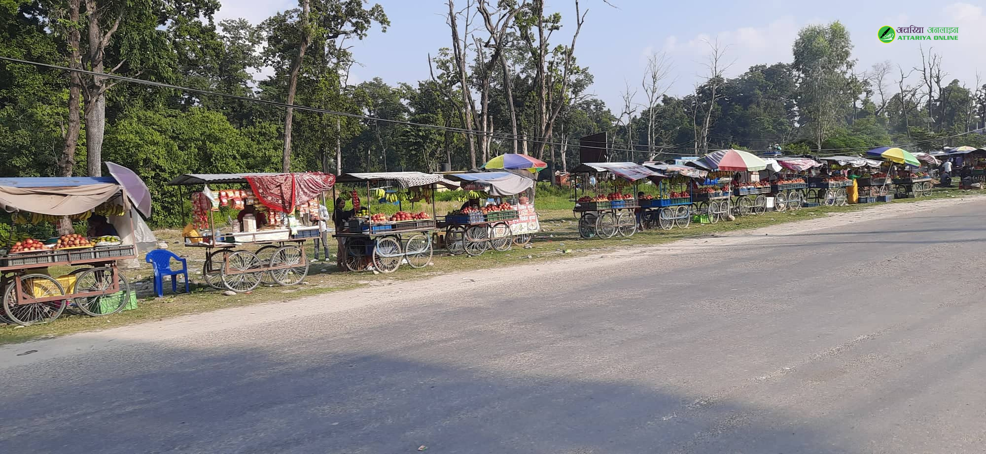 अत्तरियाको पहाड रोडको किनारामा राखिएका ठेलागाडा । गोदावरी नगरपालिकाले बजार क्षेत्रबाट ठेलागाडा हटाउन भनेपछि अहिले ठेलागाडा व्यवसायीहरुले बसपार्क संगै जोडिएको पहाड रोड किरानामा राख्ने गरेका छन ।