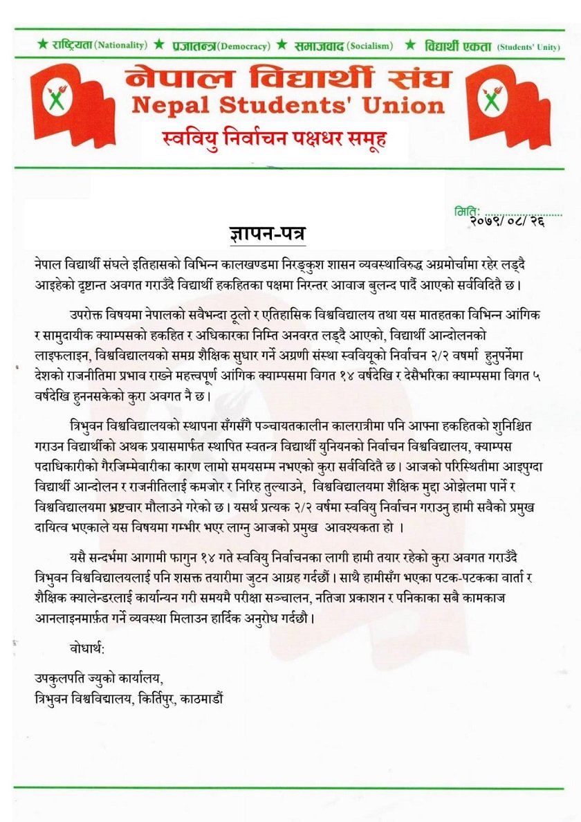 तोकिएकै मितिमा स्वतन्त्र विद्यार्थी युनियन (स्ववियु) निर्वाचन गराउन माग गर्दै नेपाल विद्यार्थी संघले त्रिभुवन विश्वविद्यालयलाई ज्ञापनपत्र बुझाएको छ । नेविसंघ स्ववियु निर्वाचन पक्षधर समूहले त्रिविले तोकेकै मितिमा स्ववियु चुनाव गर्न माग गर्दै उपकुलपतिलाई ज्ञापनपत्र बुझाएको हो ।