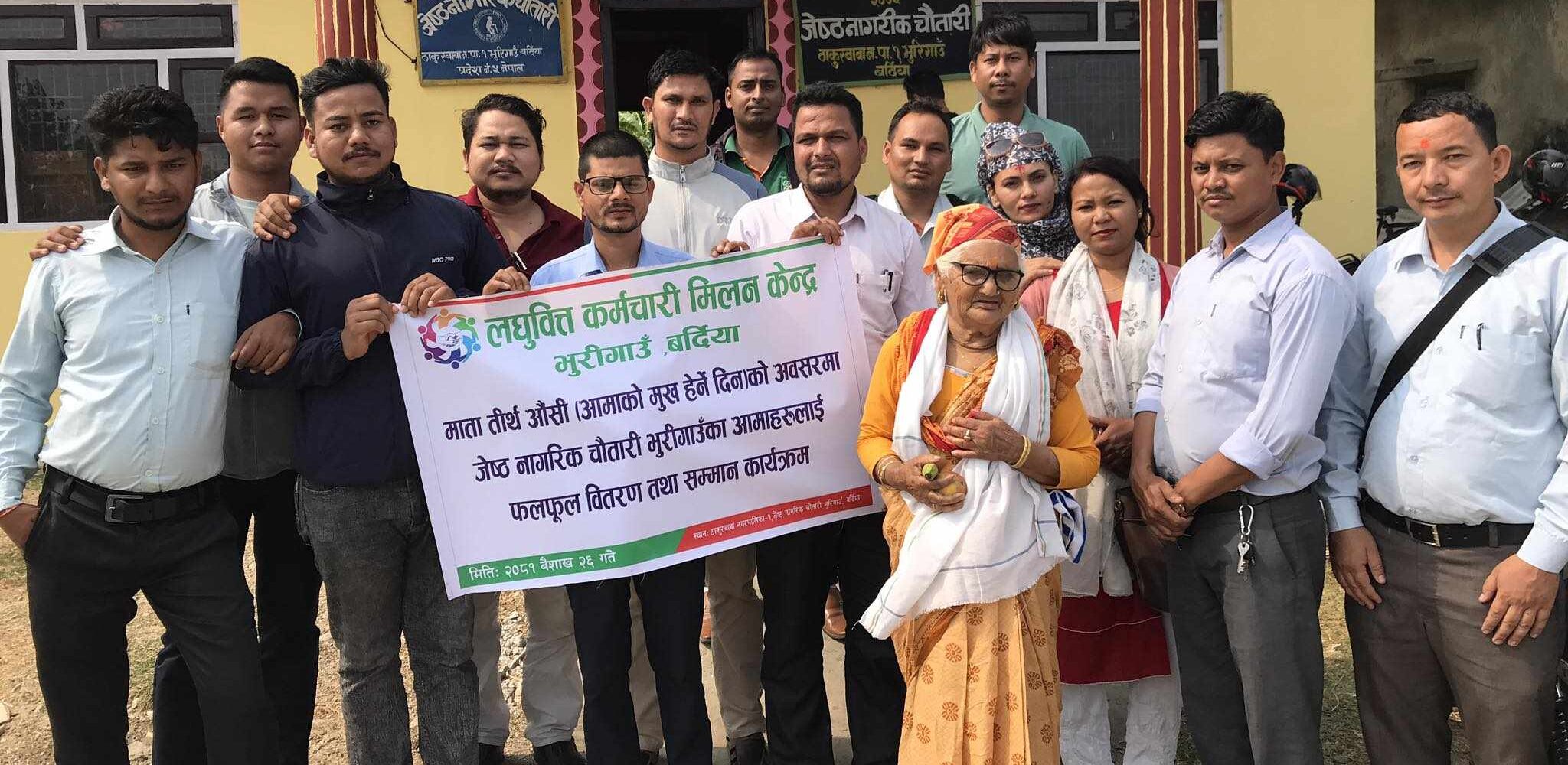 अत्तरिया– बर्दियाको भुरियाउँमा रहेको ज्येष्ठ नागरिक चौतारीका आमाहरुलाई फलफुल वितरण गरिएको छ । जिल्लाको ठाकुरबाबा नगरपालिकामा अवस्थित लघुबित्त कर्मचारिको संस्था भुरिगाउ लघुबित्त मिलन केन्द्रले ज्येष्ठ नागरिक चौतारीमा रहेका आमाहरुलाई फलफुल वितरण गरेको हो ।