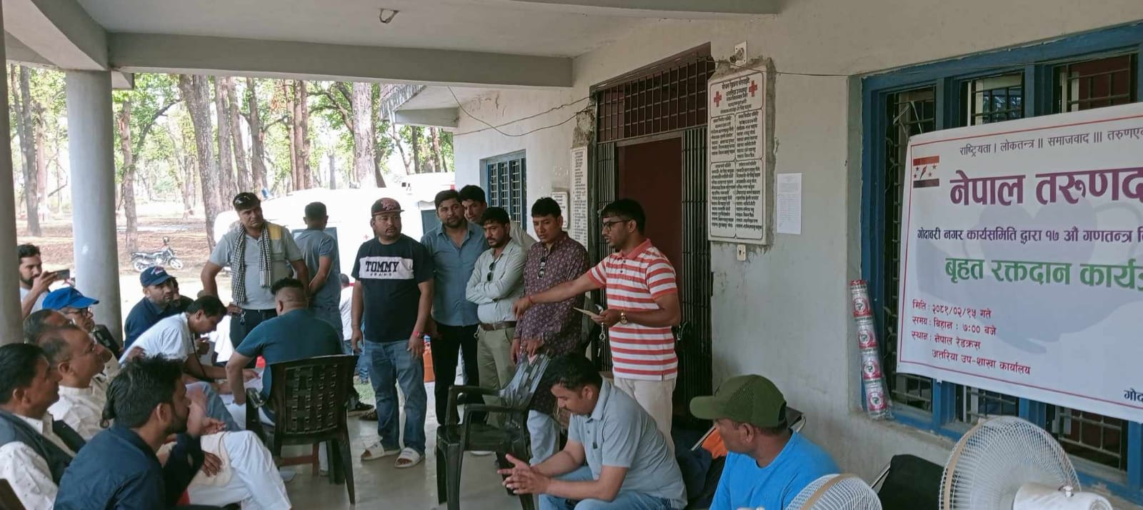 मंगलबार परेको गणतन्त्र दिवसको अवसरमा तरुण दलले रक्तदान कार्यक्रमको आयोजना गरेको थियो । स्थानिय नेता, युवा, व्यवसायी, राजनितिक पार्टीका प्रतिनिधि लगायतको सहभागितामा सफलतापुर्वक कार्यक्रम सम्पन्न भएको उनले बताए ।